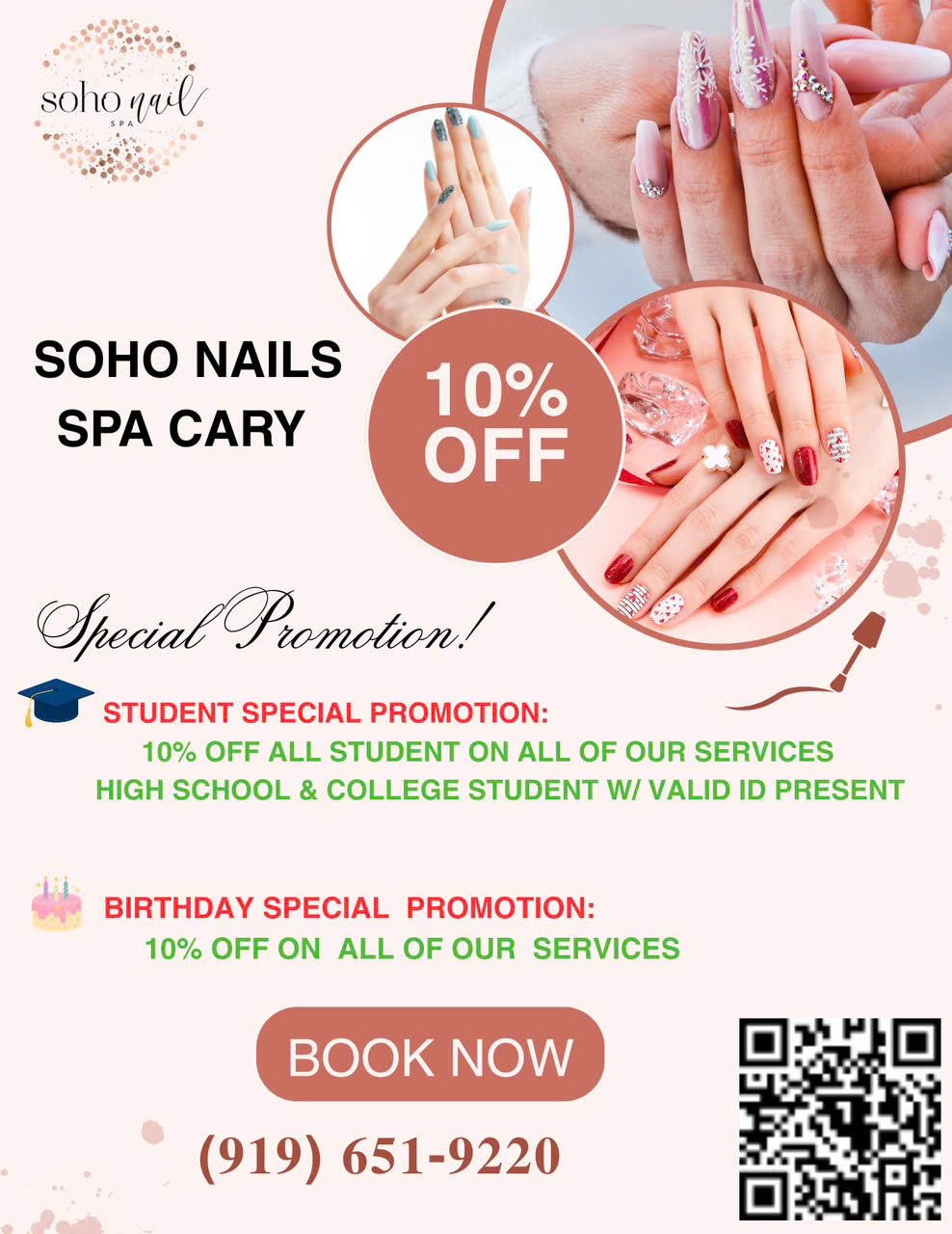 Welcome to Soho Nail Spa Cary, an elegant nail salon in Cary, NC 27513 where beauty, comfort, and relaxation come together. Step into our modern, serene space and let our skilled technicians take care of you with exceptional nail services and rejuvenating spa treatments designed to refresh your body and uplift your mood.
