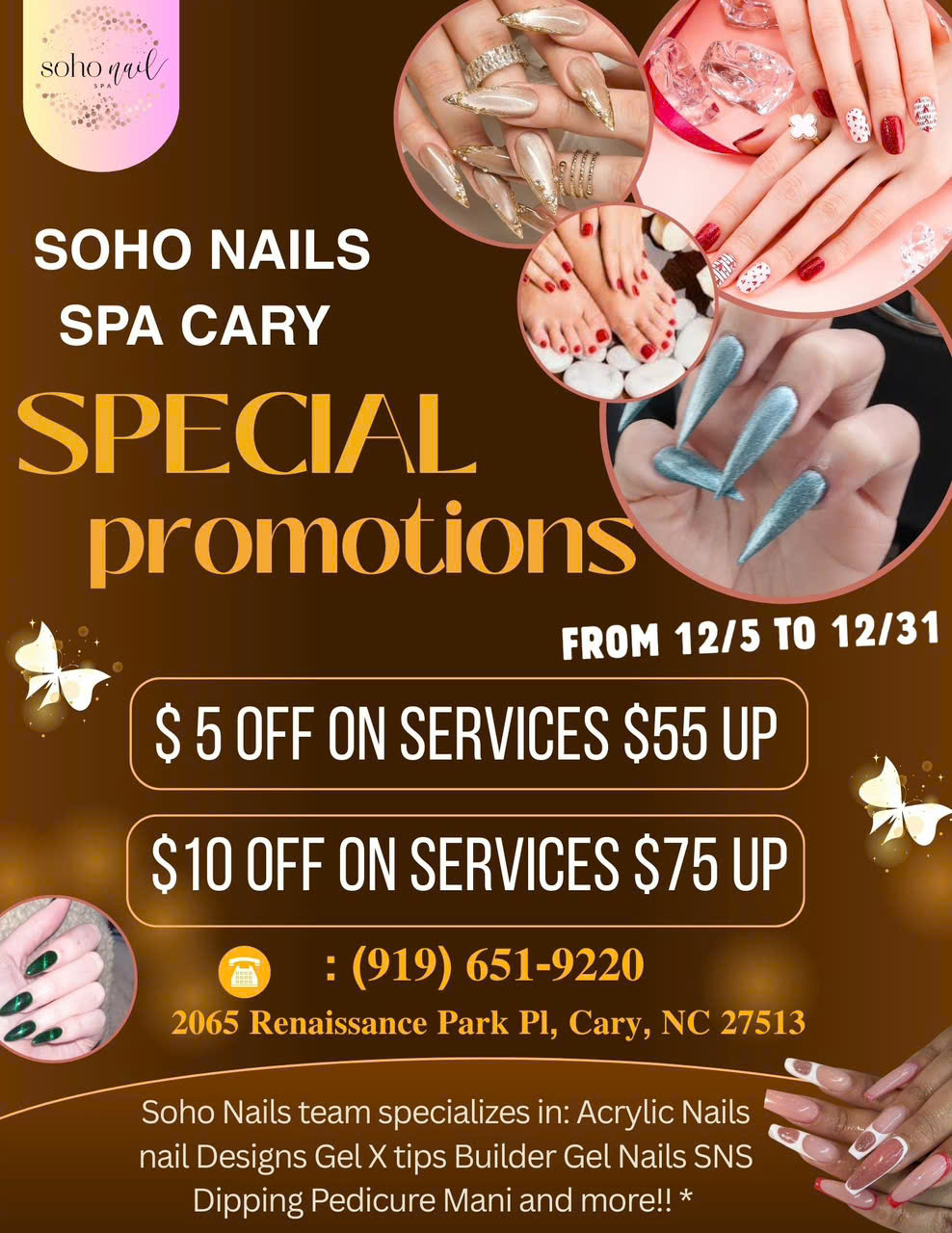 Welcome to Soho Nail Spa Cary, an elegant nail salon in Cary, NC 27513 where beauty, comfort, and relaxation come together. Step into our modern, serene space and let our skilled technicians take care of you with exceptional nail services and rejuvenating spa treatments designed to refresh your body and uplift your mood.